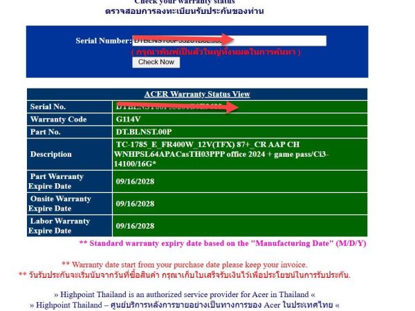 ประกันศูนย์ Acer onsite : 16 SEP 2028